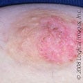 There are two very rare types of cancer that also display visible changes to the skin on the breast or the nipple. Paget’s disease, while incredibly rare – accounting for less than 5% of all breast cancers – involves symptoms of the nipple including redness, itching, burning, or flaky/scaly skin resembling eczema. There is underlying breast cancer associated with 95% of instances of Paget’s disease.
